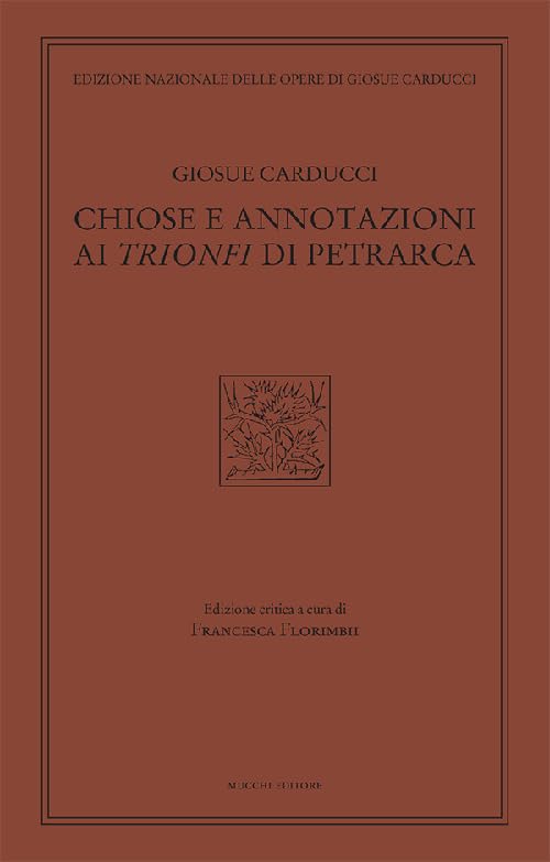 Nella lunga fedeltà di Carducci nei confronti di Petrarca c'è una zona d'ombra che riguarda i Trionfi. In un arco cronologico di quasi cinquant'anni, sono infatti rari gli affondi di Carducci sul poema italiano di Petrarca: non a caso, mentre nel 1896 usciva a Firenze l'edizione di Canzoniere e Trionfi dovuta a Giovanni Mestica, nel 1899 Carducci e Severino Ferrari pubblicavano le sole rime del Canzoniere. Eppure, nella Casa-Museo di Bologna si conservano due fascicoli di carte che trasmettono il suo commento, sino ad ora rimasto inedito, a cinque capitoli trionfali: un commento avviato nei primi anni Sessanta dell'Ottocento e abbandonato da Carducci in uno stato ancora provvisorio dopo il 1893, ma già fornito di un impianto storico ed erudito, fondato sulla tradizione esegetica precedente, volto all'esatta comprensione della lettera e integrato da annotazioni filologiche, linguistiche e stilistiche proprie del Carducci maturo. Questa edizione critica propone quindi per la prima volta il testo del commento di Carducci ai Trionfi, rispettando il più possibile lo stato degli autografi. Il testo è corredato di un apparato critico che dà conto degli interventi dell'autore sulle carte (emendamenti, aggiunte, cassature) e accompagnato da alcune note orientate a valorizzare la carducciana "arte del commento".