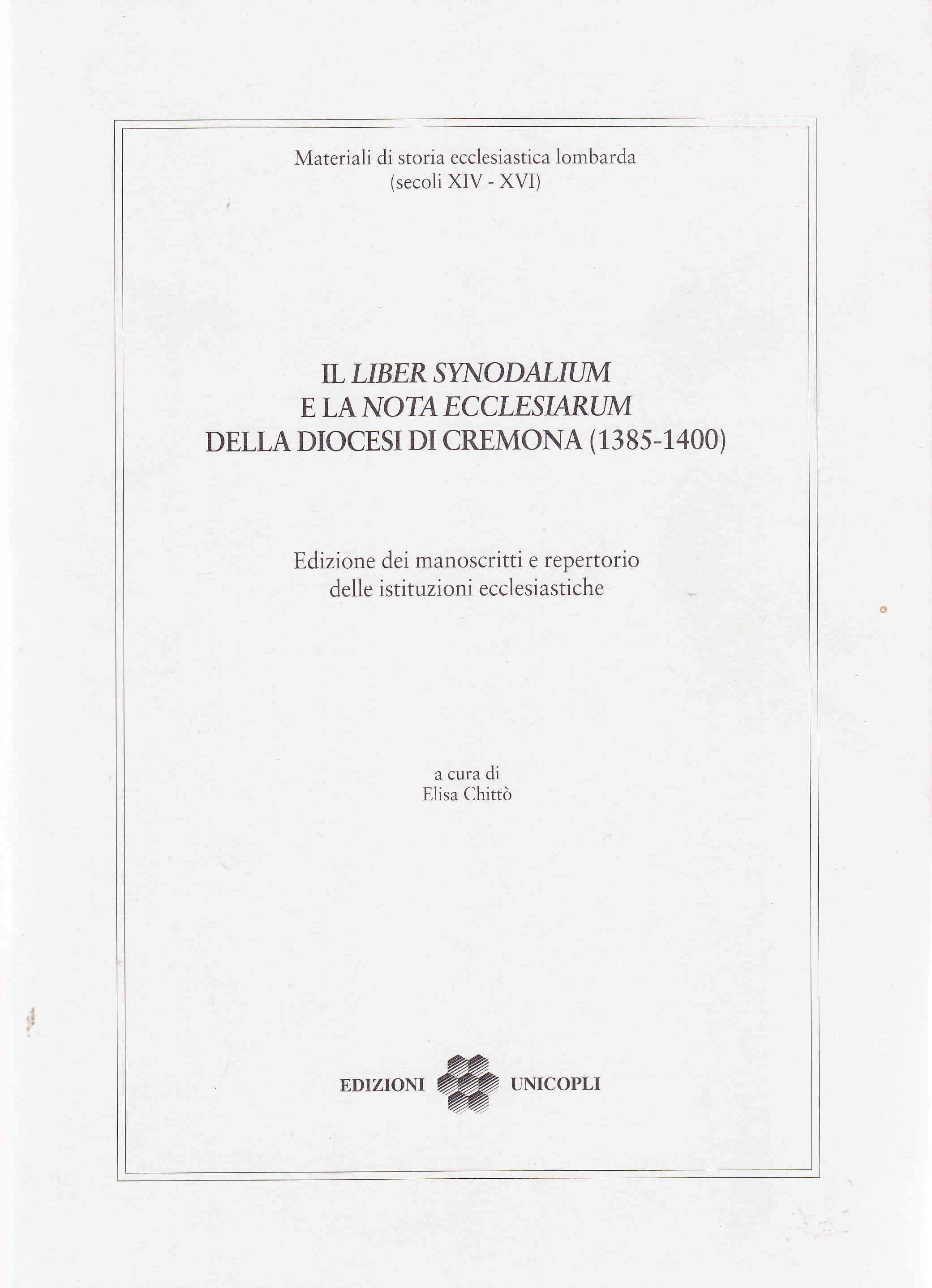 Il volume presenta l'edizione di due interessanti fonti documentarie tardo-trecentesche - Il Liber Synodalium, conservato all'Archivio Storico Diocesano e la Nota ecclesiarum, conservata all'Archivio Storico della prepositura di Sant'Agata - che permettono di avere un quadro abbastanza completo delle istituzioni ecclesiastiche della diocesi di Cremona sullo scorcio del XIV secolo.