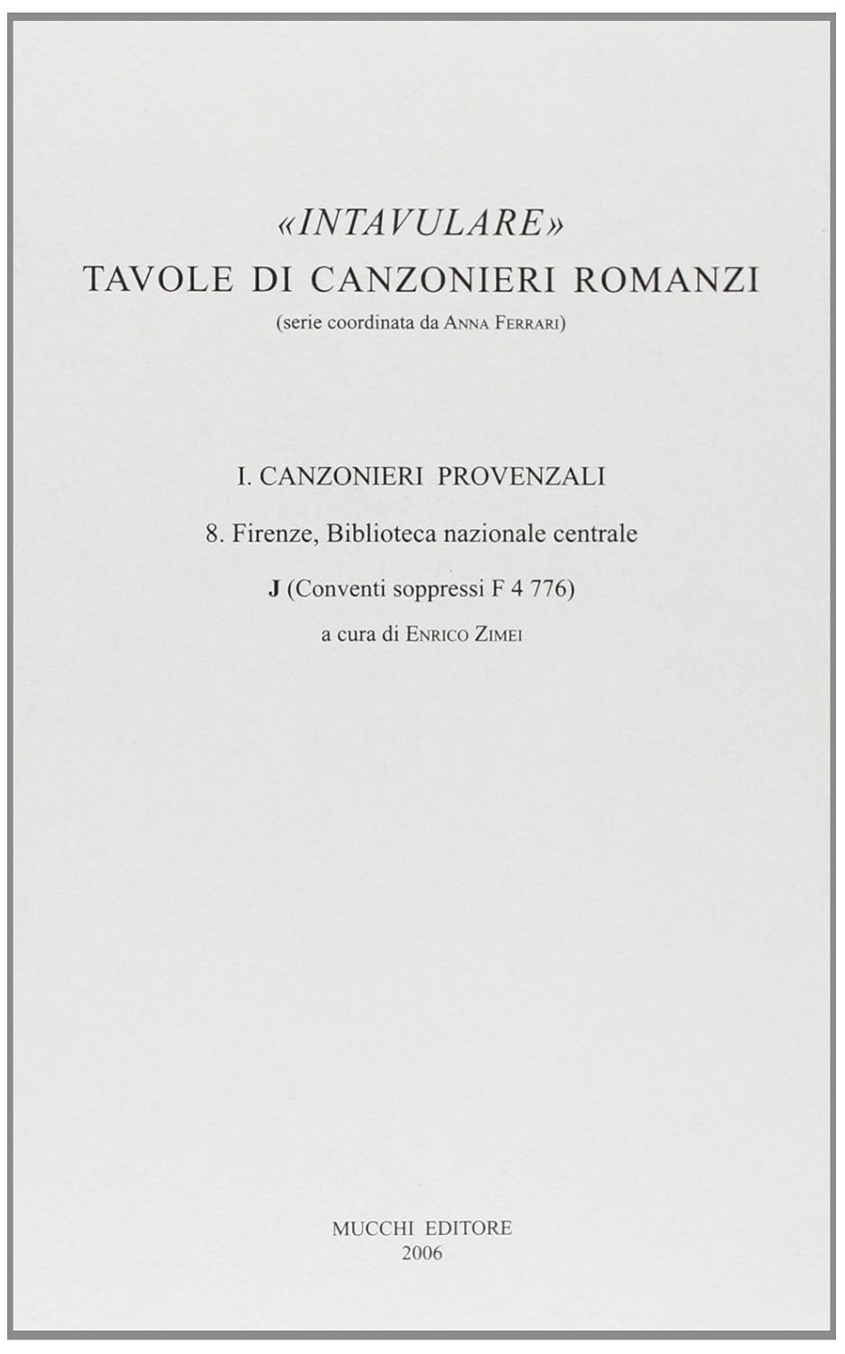 "Intavulare". Tavole di canzonieri romanzi. Canzonieri provenzali 8. Firenze, Biblioteca Nazionale Centrale, J (Conventi soppressi f 4 776)