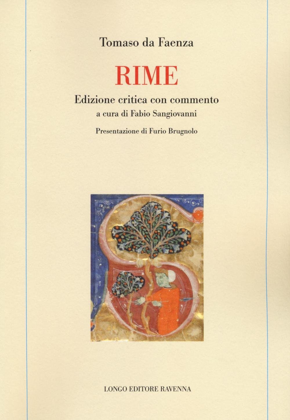 Tra i romagnoli che, nel De vulgari eloquentia, «a proprio poetando divertisse audivimus», tra coloro cioè che con merito poetico si allontanarono dal proprio volgare, Dante individua Tomaso da Faenza, giudice in attività dagli anni Sessanta del Duecento sino, probabilmente, ai primissimi del Trecento, autore di quattro canzoni e nove sonetti secondo le testimonianze dei canzonieri delle origini e del ms. 4 della Società Dantesca Italiana. Nel corpus spiccano i non facili componimenti in tenzone, con Monte Andrea, Giovanni dall'Orto (contro i quali la specializzazione tomasiana si fisserà sulla difesa di Amore), Cino da Pistoia e Onesto da Bologna (coinvolti in una celebre, ma fumosa, tenzone politica), che delineano il faentino come rilevante, benché non principale, rimatore centro-settentrionale. La nuova edizione critica che qui si propone raccoglie per la prima volta tutta la produzione di Tomaso, comprendendo altresí le rime dei corrispondenti, e presenta un ampio apparato esegetico vòlto al commento puntuale dei testi sinora imperfettamente editi o interpretati.