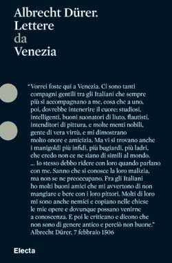 In concomitanza con la mostra alle Scuderie del Quirinale ("Dürer e l'Italia", Roma, 10 marzo-9 giugno 2007), analizzando le "Lettere da Venezia" scritte dall'amico Pirckheimer, qui per la prima volta compiutamente tradotte in italiano, l'autore affronta l'intenso rapporto culturale e umano che legava il grande artista del Rinascimento tedesco agli italiani, descritti nei loro costumi con una sofferta ironia. Il volume fa parte della collana "Pesci Rossi", in cui i testi "letterari" di autorevoli studiosi e giovani intellettuali sono racchiusi in volumi raffinati che si distinguono per una cura antica nella scelta e nella riproduzione delle immagini.