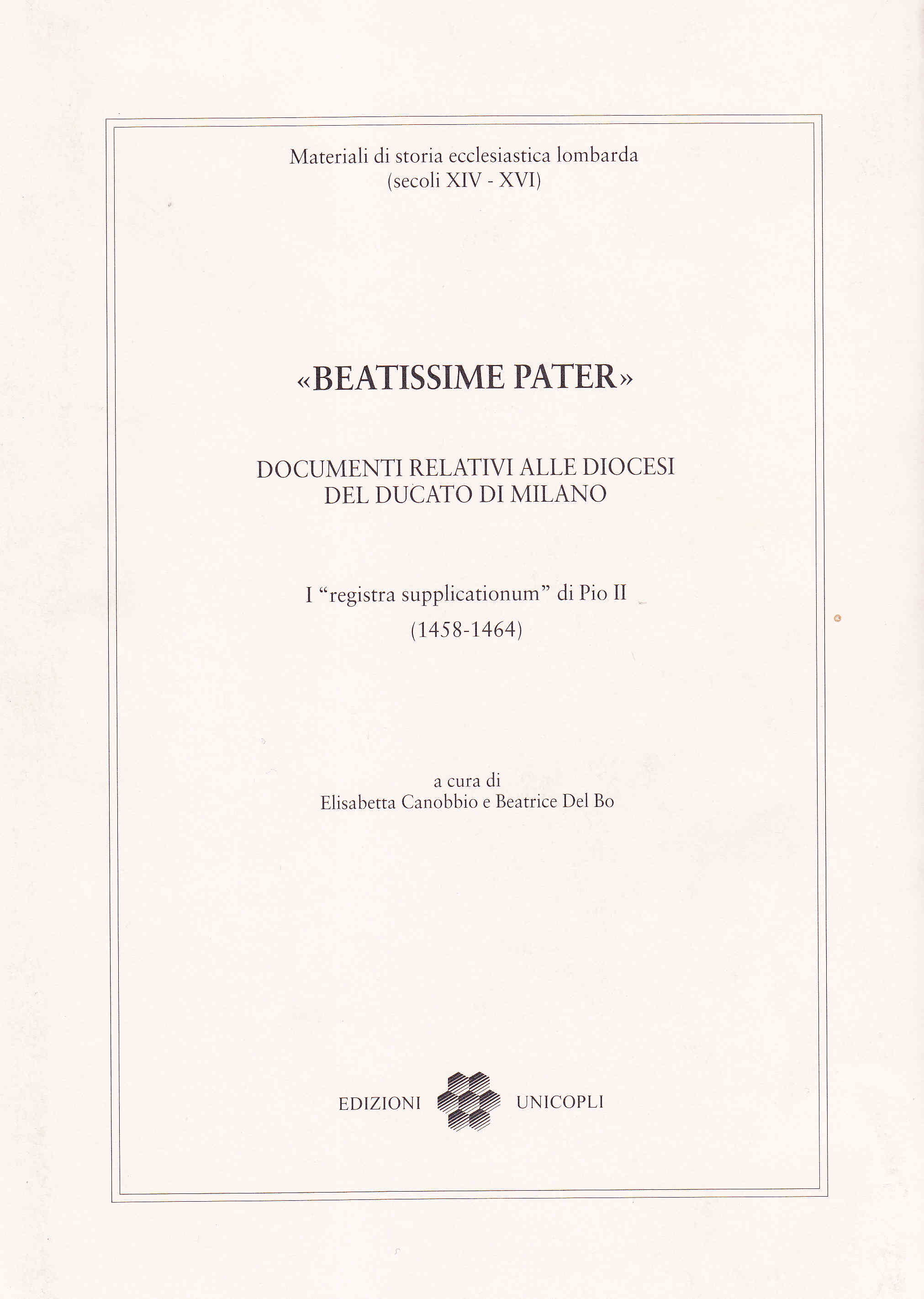 "Beatissime Pater". Documenti relativi alle diocesi del Ducato di Milano. I "registra supplicationum" di Pio II (1458-1464)