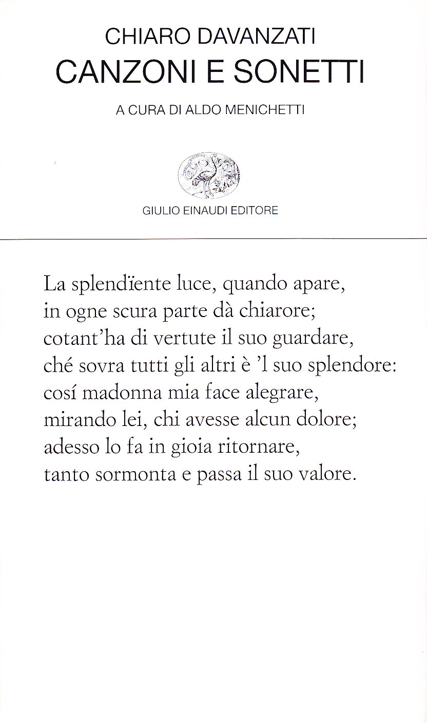 Legato allo stile dei provenzali e dei siciliani nella seconda metà del Duecento, quando cominciava a imporsi lo stilnovo, Chiaro Davanzati ha goduto di una fama breve. Già la generazione successiva lo dimentica, non ne tiene conto, non lo nomina nemmeno. Eppure Chiaro, come dice Aldo Menichetti nella sua introduzione, «è il rimatore più rappresentativo della poesia fiorentina prima di Dante», sia per la tecnica, sia per la quantità dei testi tramandati. La sua rappresentazione dell'amore non ha nulla dell'impegno spirituale, intellettuale ed esistenziale degli stilnovisti; nei suoi versi c'è piuttosto l'amore carnale, il buon senso borghese, la leggerezza dei toni. Il suo vecchio stile è diventato rapidamente fuori moda, ma ha avuto tutto il tempo per essere rivalutato. L'edizione critica di tutte le rime, realizzata da Aldo Menichetti negli anni Sessanta, ha ridato a Chiaro il posto di primo piano che gli spetta fra i poeti del Duecento. Oggi lo stesso studioso ha curato questa scelta di poesie, commentate per un più ampio pubblico.