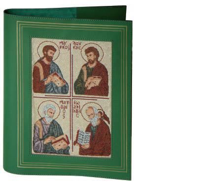Copertina in vera pelle per lezionari con scritte in trancia oro. Al centro un’immagine in tessuto jacquard, ottenuta dall’intreccio di fili colorati e dorati lavorati al telaio, raffigurante i quattro evangelisti. La copertina è interamente prodotta e confezionata in Italia con certifi cazione di vera pelle di qualità Made in Italy.