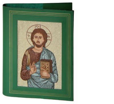 Copertina in vera pelle per lezionari con scritte in trancia oro. Al centro un’immagine in tessuto jacquard, ottenuta dall’intreccio di fili colorati e dorati lavorati al telaio, raffigurante Cristo datore di vita. La copertina è interamente prodotta e confezionata in Italia con certifi cazione di vera pelle di qualità Made in Italy.