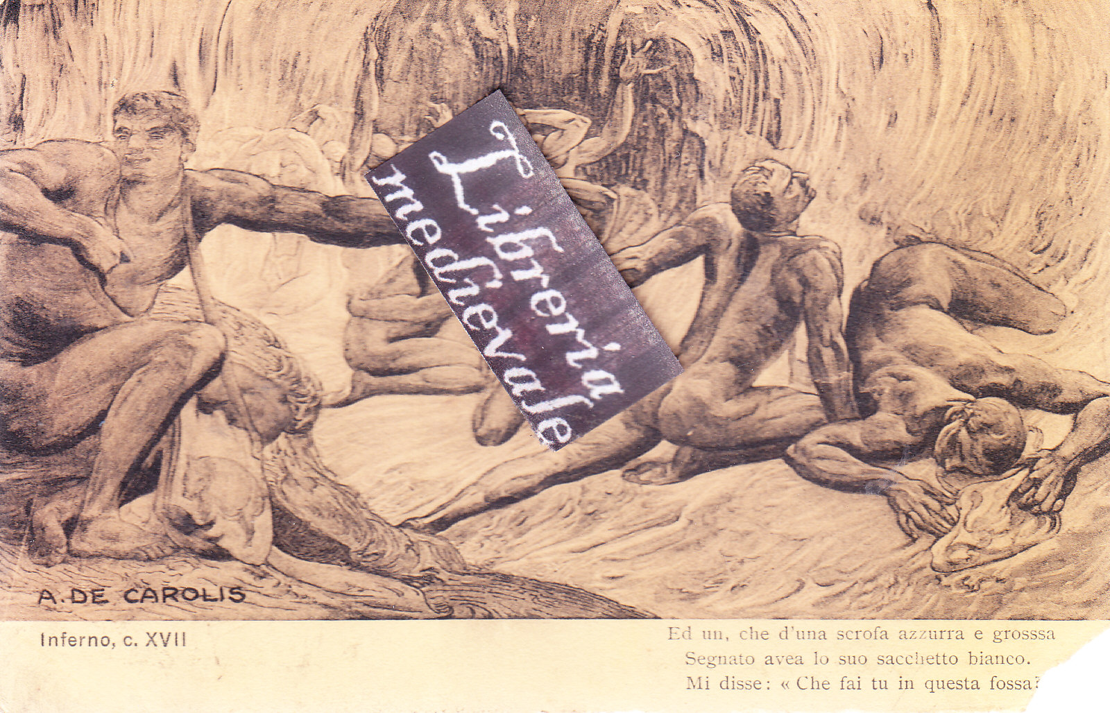 TITOLO/DENOMINAZIONE: Inferno, c. XVII. Ed un, che d'una scrofa azzurra e grossa Segnato avea lo suo sacchetto bianco. Mi disse: "Che fai tu in questa fossa?" - CARTOLINA