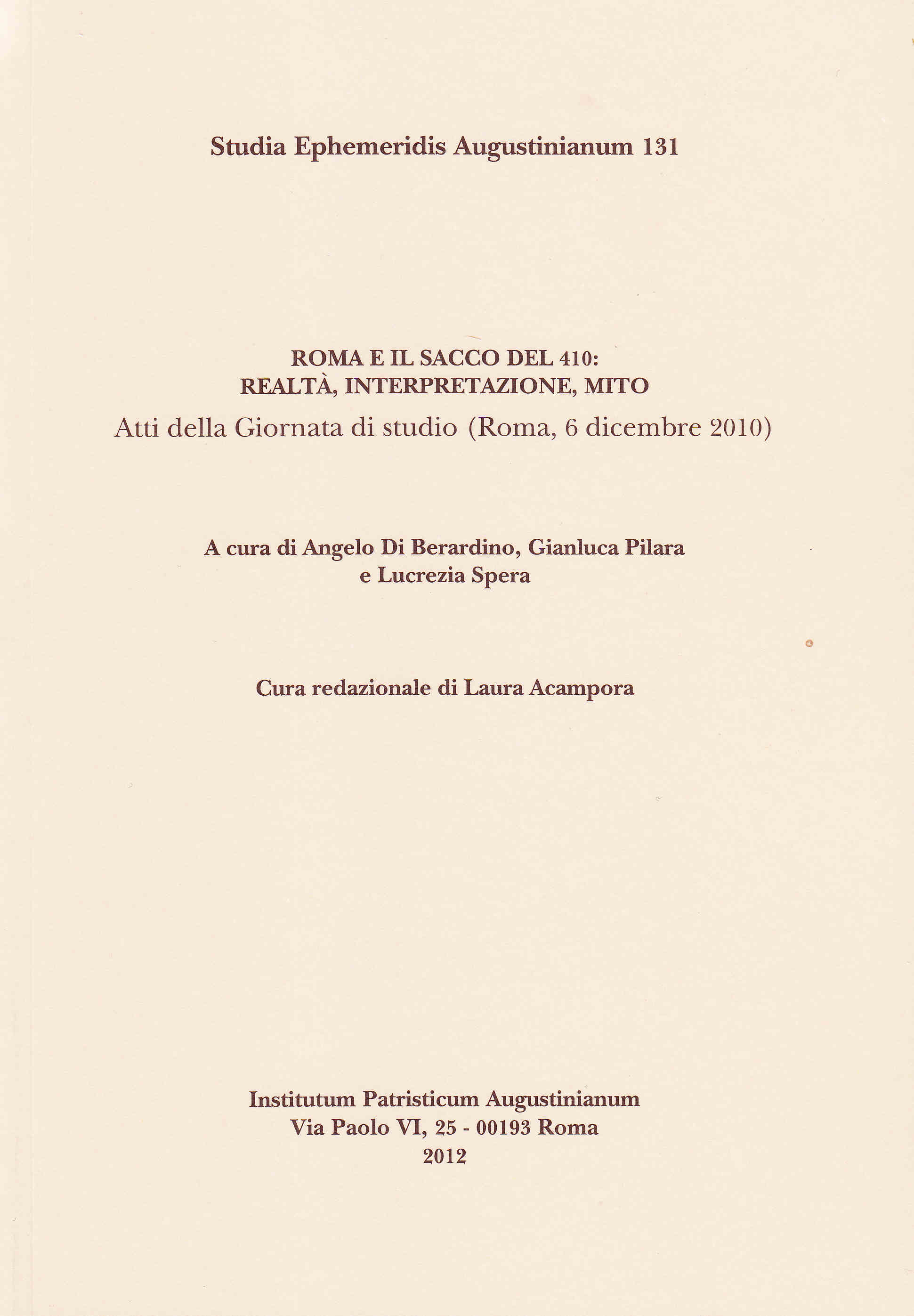 Il volume raccoglie i saggi presentati a Roma, durante una giornata di studi svoltasi in occasione del sedicesimo centenario del celebre sacco perpetrato dai Goti di Alarico.