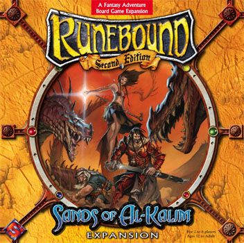In this expansion to the Runebound fantasy adventure board game, the players have found the key to this hidden place. Their goal is to forge their own entry in the Ninety-Nine Tales of Al-Kalim. Sands of Al-Kalim differs from most Runebound adventures in that it does not include Encounter and Event cards that describe a set story. Rather, the players tell the story! They will face legendary challenges and gain legendary rewards, including mighty mounts, forgotten runes, and magical artifacts. He who completes his tale first is immortalized in song and legend, and wins the game.