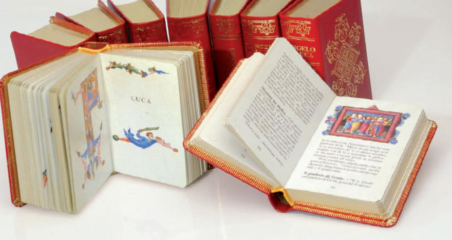 Prestigiose e raffinate «edizioni mignon» da amatore, di Testi Sacri, stampate a 5 colori su carta pergamenata. Opere «miniate» come gli antichi «Libri d’Ore» con i più pregevoli Codici Antichi; raffinata rilegatura in pelle con fregi e taglio oro.